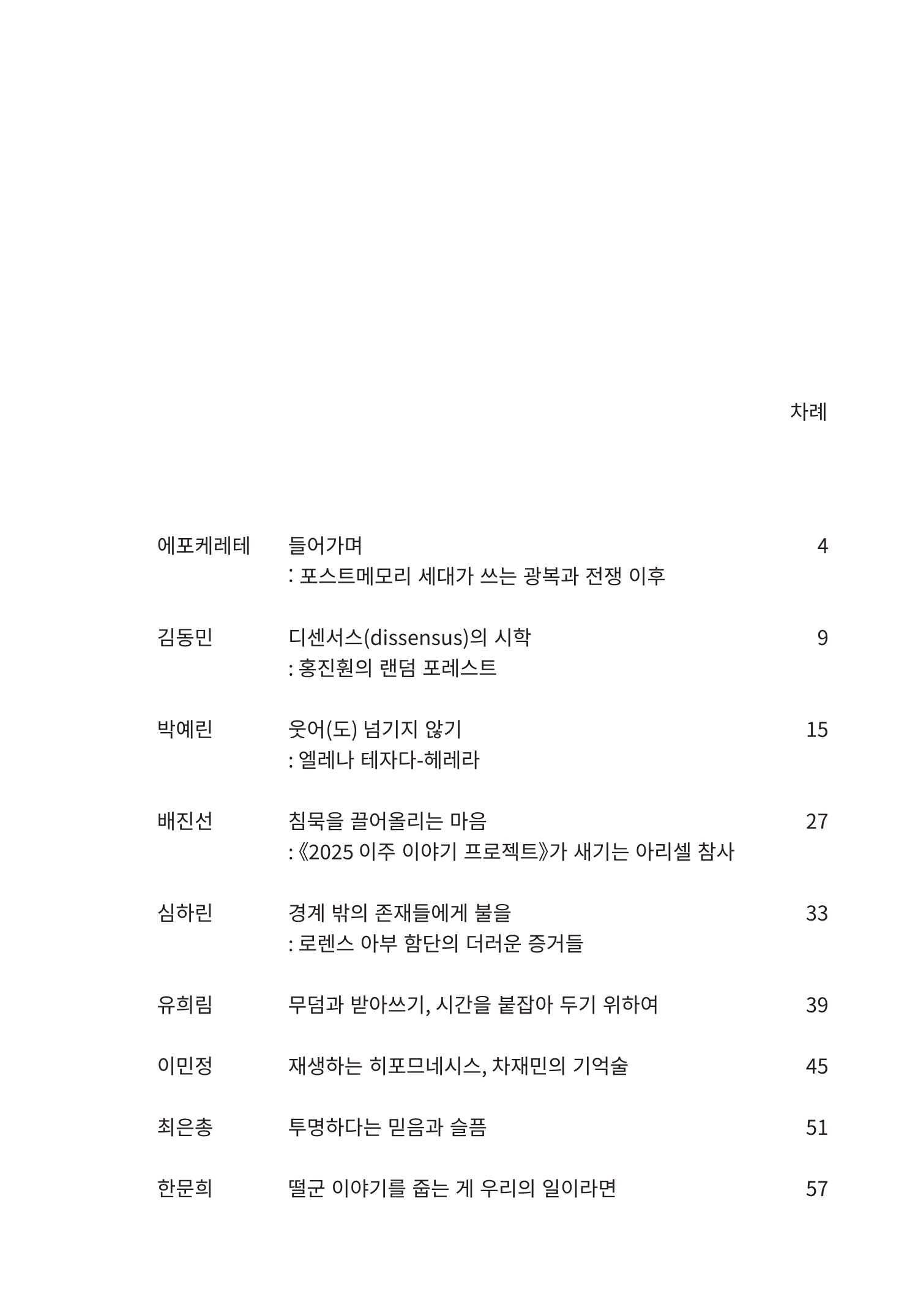 『에포케 레테 2025 앤솔로지』의 필진들은 저마다의 감각으로 국가적 차원의 폭력과 식민주의, 그리고 전쟁을 사유하는 여러 예술가와 현장을 마주했다. 김동민은 홍진훤의 《랜덤 포레스트》 연작을 통해 사진이 사건들 간의 불연속적 연결을 드러내는 방식을 탐구한다. 랜덤하게 배치된 이미지들이 만들어내는 '사건의 불연속'은 폭력 이후의 사회를 응시하는 사진의 실천이다. 박예린은 엘레나 테자다-헤레라의 퍼포먼스·비디오가 페루의 독재 권력, 성·젠더 기반 폭력, 이주·노동·자원 착취가 공유하는 폭력의 구조를 어떻게 드러내는지 분석한다. 유머와 웃음을 폭력에 맞서고 새로운 미래를 상상하는 전략으로 읽어낸다. 배진선은 2024년 화성 아리셀 리튬공장 화재 참사를 다룬 《2025 이주 이야기 프로젝트》를 분석하며, 이주노동자의 죽음을 ‘국가적 애도’가 포착하지 못하는 틈에서 예술이 어떻게 기억을 복원할 수 있는지를 보여준다. 심하린은 로렌스 아부함단의 사운드 작업을 통해, 소리와 침묵이 권력과 지배의 구조를 드러내는 ‘청각의 정치학’을 탐색한다. 유희림은 최승자와 차학경의 텍스트를 통해 여성의 몸과 기억을 ‘무덤이자 기록의 장소’로 읽으며, 사라져가는 목소리를 ‘받아쓰기’할 것을 제안한다. 이민정은 차재민의 무빙 이미지를 기억을 대리 보충하는 기억술(hypomnesis)의 관점으로 바라보며, 예술이 제도적 아카이브가 배제한 ‘하위주체의 기억’을 재생하는 한 방편이 될 수 있음을 제시한다. 최은총은 권병준, 전혜주, 정승의 작업을 중심으로 기술·자본·전쟁의 복합적 구조를 비판한다. ‘투명성’이라는 믿음이 실은 권력의 시각 체계임을 드러내며, 기술을 전복하는 예술의 실천을 모색한다. 한문희는 정연두의 작업을 통해 타인의 서사를 어떻게 ‘시혜적 연민’ 없이 들을 수 있을지를 고민하며, 타자와의 관계에서 예술적 발화의 새로운 거리를 제시한다.