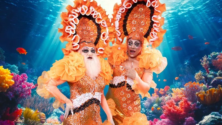 한편 최근 비디오 작업 〈다윈 드랙 Darwin Drag〉(2025)에서 다윈으로 분장한 키하라는 “퀴어한 동물 퀸덤(queer animal queendom)에 관한 비밀을 간직하고 있”다고 고백한다(도 3). 『종의 기원 On the Origin of Species』(1859)에서 성을 바꾸는 양방향(bi-directional) 자웅동체 동식물을 생략한 것을 후회하는 그의 앞에 드랙 퀸이자 ‘요정 물고기 어머니(fairy fishmother)’인 벅윗(BUCKWHEAT)이 나타나 다윈에게 드랙 분장을 해주고, 이들은 함께 산호초를 유영하며 자웅동체 어종들을 탐구한다(도 4).6) 바닷속 다윈 드랙은 산호초와 물고기에 둘러싸여 성별을 바꾸는 종의 존재가 있음을 고백한다. 과장된 속눈썹과 연장한 손톱, 러플 장식과 시퀸 드레스. 여성적 기표를 입은 다윈에게 남태평양의 따뜻한 해류는 분리하는 선이 아닌 건너가는 장소가 되며, 비로소 그는 '여성의 방식으로' 회피했던 지적 책임을 이행한다.